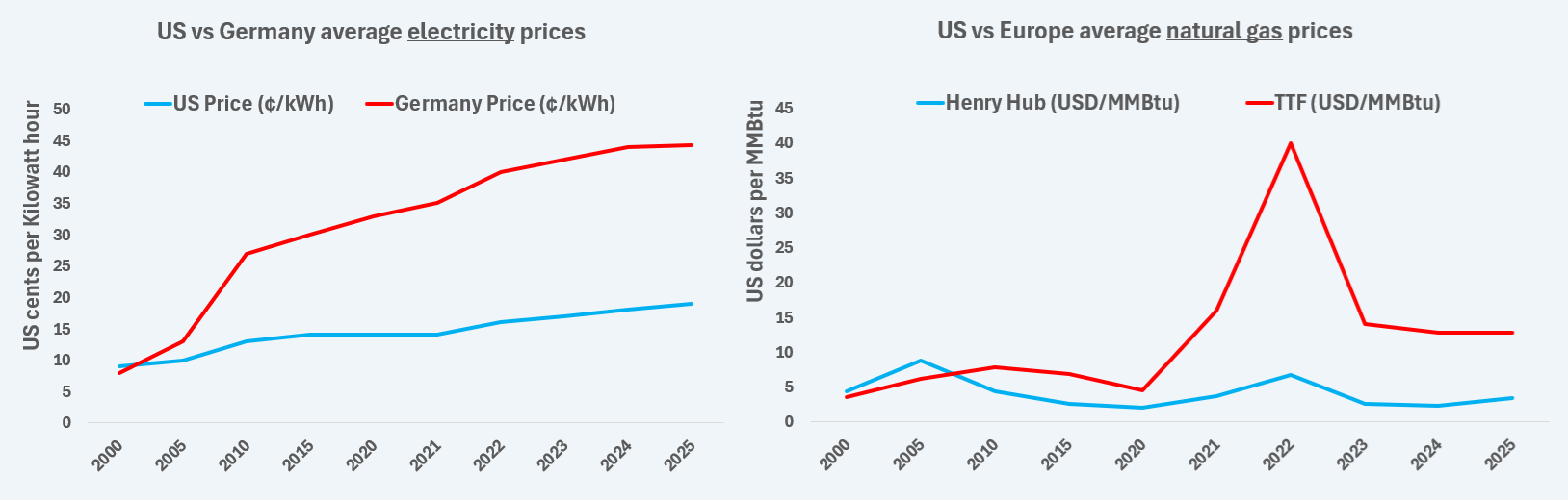 Κάπως έτσι διαμορφώθηκε η σημερινή ισορροπία. Το φυσικό αέριο έγινε η δεύτερη μεγαλύτερη πηγή ενέργειας σε ΕΕ και ΗΠΑ, με τους αναλυτές να προβλέπουν περαιτέρω ενίσχυσή του κατά τις επόμενες δεκαετίες. Εδώ, όμως, σταματούν οι διαφορές. Το τραύμα του 2022 παραμένει επίπονο για την ΕΕ, με τις επιπτώσεις να είναι ακόμα ορατές, καθώς οι τιμές του φυσικού αερίου το 2025 είναι 90% υψηλότερες από τις τιμές μεταξύ 2010-2020. Αντιθέτως, στις ΗΠΑ οι τιμές του φυσικού αερίου είναι μόλις 12% ακριβότερες για το ίδιο διάστημα, αναδεικνύοντας την κρίσιμη διαφορά μεταξύ παραγωγού και εισαγωγέα. Αν και δεν κινούνται σε ιδανικά επίπεδα, η εικόνα στις τιμές ηλεκτρικής ενέργειας είναι σαφώς καλύτερη. Για παράδειγμα, οι τιμές στη Γερμανία είναι 50% υψηλότερες το 2025 σε σχέση με την περίοδο 2010-2020, ενώ στις ΗΠΑ κατά 40%.