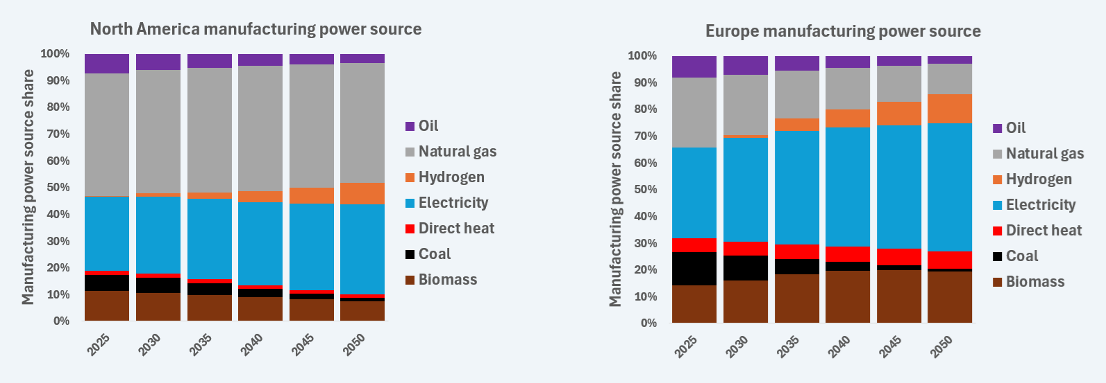Οι αριθμοί είναι σαφείς. Για την ΕΕ, η ηλεκτρική ενέργεια είναι φθηνότερη από το φυσικό αέριο, κυρίως χάρη στις ΑΠΕ και την πυρηνική ενέργεια. Για τις ΗΠΑ, το φυσικό αέριο είναι φθηνότερο και άμεσα προσβάσιμο. Τα δεδομένα αυτά έχουν αρχίσει να διαμορφώνουν δύο αποκλίνουσες πραγματικότητες σε ΕΕ και ΗΠΑ. Για την ευρωπαϊκή βιομηχανία, ο εξηλεκτρισμός είναι η μόνη λύση. Το 2025, το 33% των μονάδων μεταποίησης χρησιμοποιεί ηλεκτρική ενέργεια για τη λειτουργία του. Το ποσοστό αυτό θα εκτοξευθεί στο 48% το 2050. Αντίστοιχα, το μερίδιο του φυσικού αερίου στη μεταποίηση αναμένεται να μειωθεί από 28% το 2025 στο 11% το 2050. Αντιθέτως, η αμερικανική βιομηχανία δεν θα αναγκαστεί να επιλέξει. Το ποσοστό των επιχειρήσεων που λειτουργούν με φυσικό αέριο βρίσκεται στο 46% το 2025 και προβλέπεται να μείνει σταθερό μέχρι το 2050. Την ίδια περίοδο, το μερίδιο του ηλεκτρισμού στη μεταποίηση θα αυξηθεί από το 27% στο 34%.