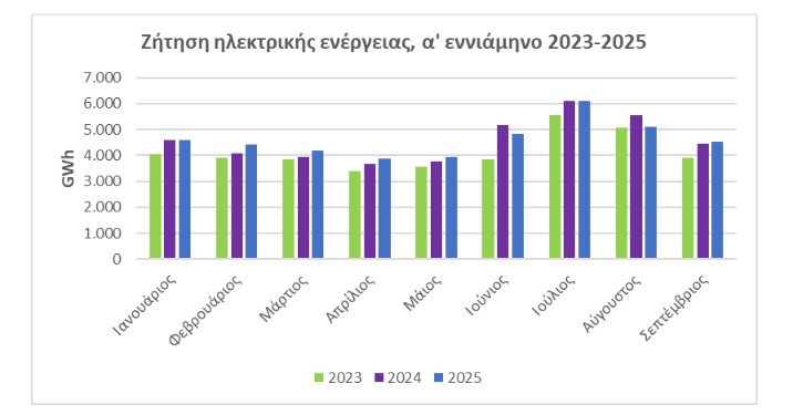 Διάγραμμα 1: Ζήτηση ηλεκτρικής ενέργειας στην Ελλάδα, α’ εννιάμηνο 2023-2025