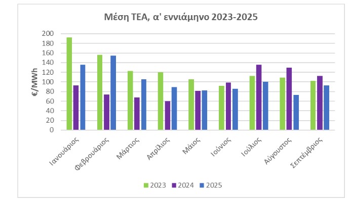 Διάγραμμα 2: Μέση Τιμή Εκκαθάρισης της Αγοράς (ΤΕΑ), α’ εννιάμηνο 2023-2025