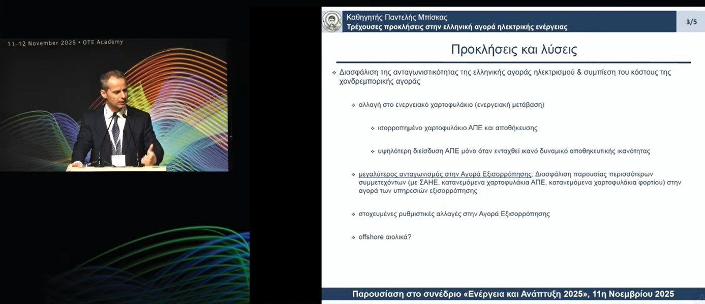Στην αποδοτικότητα του target model και στη διασφάλιση της ανταγωνιστικότητας της εγχώριας αγοράς ηλεκτρισμού εστίασε την παρουσίασή του ο καθηγητής Παντελής Μπίσκας, του Τμήματος Ηλεκτρολόγων Μηχανικών και Μηχανικών Υπολογιστών του ΑΠΘ και Πρόεδρος του Επιστημονικού Συμβουλίου του Ινστιτούτο Ενέργειας ΝΑ Ευρώπης (ΙΕΝΕ), μιλώντας στη δεύτερη συνεδρία του 29ου Εθνικού Συνεδρίου «Ενέργεια & Ανάπτυξη» που διοργανώνει το ΙΕΝΕ στο ΟΤΕ Αcademy, στα 11 και 12 Νοεμβρίου 2025.
