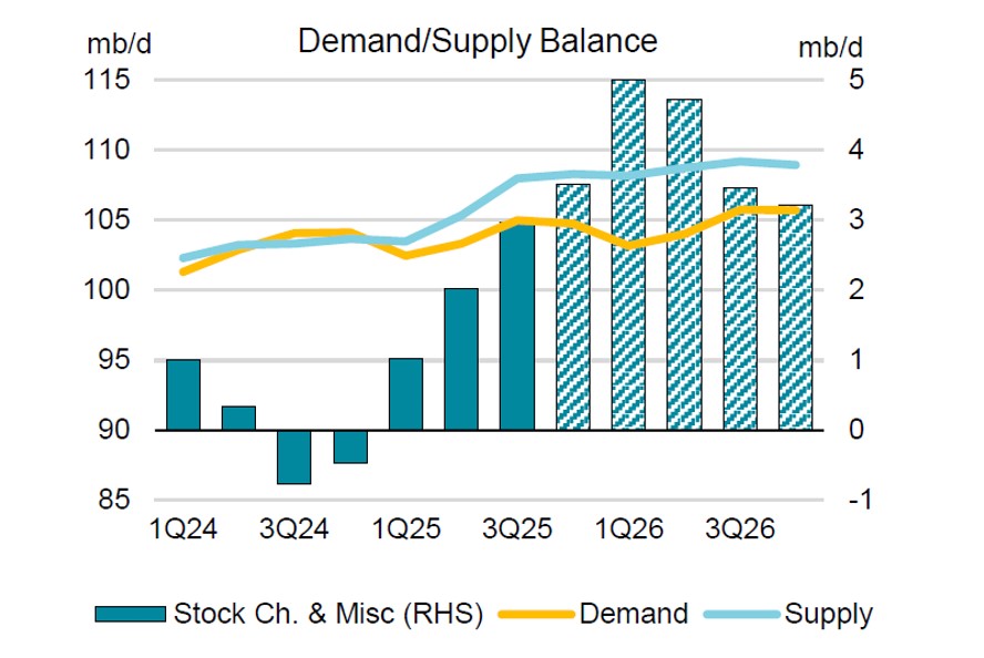 Σύμφωνα με τον ΙΕΑ, η παγκόσμια προσφορά πετρελαίου προβλέπεται να αυξηθεί κατά 3.1 εκατ. βαρέλια την ημέρα το 2025, φτάνοντας σε ετήσιο μέσο όρο τα 106.3 εκατ. βαρέλια την ημέρα – και να αυξηθεί περαιτέρω κατά 2.5 εκατ. βαρέλια την ημέρα το 2026, στα 108.7 εκατ. βαρέλια την ημέρα. Σε αντίθεση με τα προηγούμενα χρόνια, η φετινή αύξηση κατανέμεται σχεδόν ισομερώς μεταξύ των παραγωγών εκτός OPEC+ και των μελών του OPEC+.