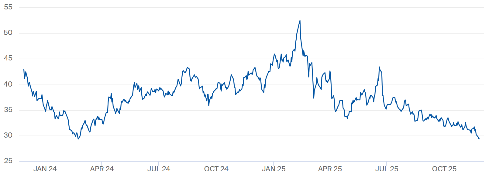 Η τιμή του TTF βρίσκεται κάτω από τα €30/MWh αυτή την εβδομάδα. Πηγή: ICE.