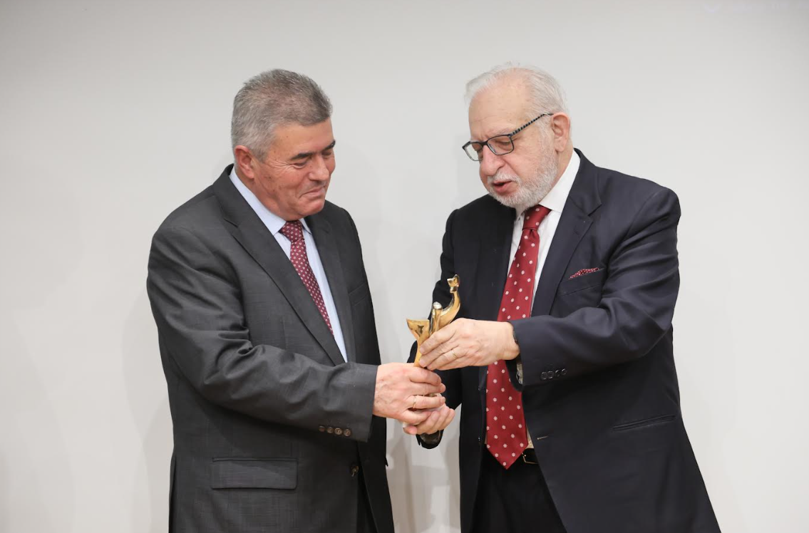 Ο κ. Σπύρος Παλαιογιάννης (αριστερά) λαμβάνει το βραβείο «Προμηθέας» 2026 από τον Πρόεδρο του ΙΕΝΕ κ. Κωστή Σταμπολή