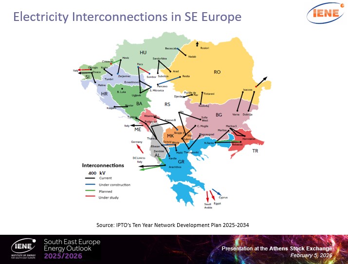 Στο κύριο μέρος της εκδήλωσης στο Χρηματιστήριο Αθηνών, ο Πρόεδρος και Εκτελεστικός Διευθυντής του ΙΕΝΕ κ. Κωστής Σταμπολής παρουσίασε εκτενώς τη μελέτη αναφοράς (flagship publication) του Ινστιτούτου, “SEE Energy Outlook 2025/2026”. Μεταξύ άλλων, υπογράμμισε ότι, με βάση τους υπολογισμούς της μελέτης, η οποίαεξετάζει σφαιρικά τα θέματα ενεργειακής προμήθειας, ενεργειακής ασφάλειας και επενδυτικών προοπτικών, οι νέες επενδύσεις σε ενεργειακές μονάδες και συστήματα στη ΝΑ Ευρώπη θα ξεπεράσουν συνολικά τα€700 δις μέχρι το 2035.